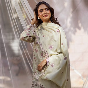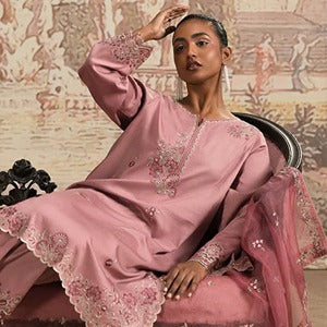Envelop yourself in this peach coloured 3PC outfit to truly celebrate the Spring weather. The soft and breathable fabric used in it serves as a base for beautiful schiffli embroidery on the shirt. Its chiffon dupatta is laden with digitally printed flowers and foliage.